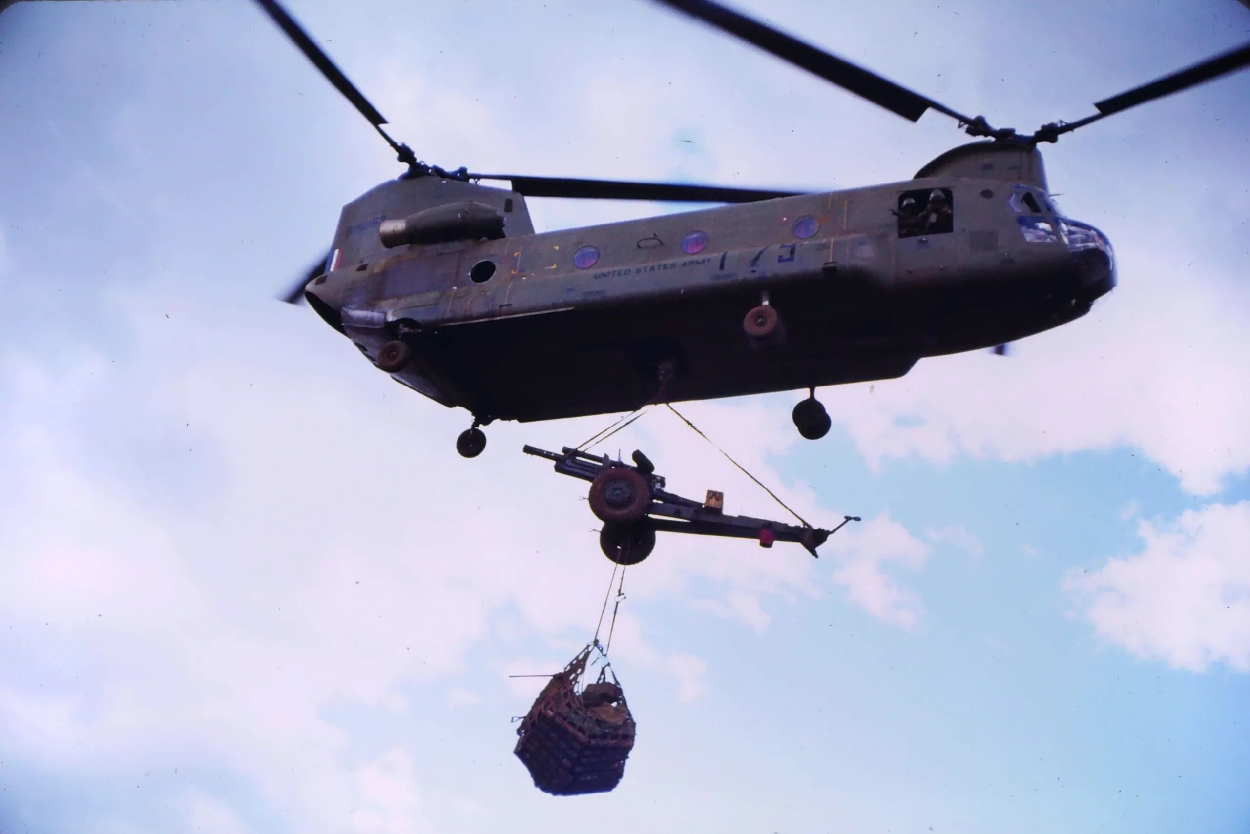 Convoyed both Joyce to Ruth, and Ruth to Plei Mrong. The guns and conex definitely flew at least one of those. If you look at the conex helicopter, that is definitely incoming. If you look at the convoy to Ruth, there is no sign of guns behind the trucks.